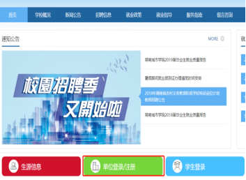 第一步:登陆云顶国际就业信息网(http://hncu.bysjy.com.cn/),点击“单位登陆/注册”,已注册单位单位直接登陆即可,未注册单位,可以点击“注册”,“入驻类型”可选择暂不招聘或者“在线招聘”,等待审核通过即可(1—2个工作日)