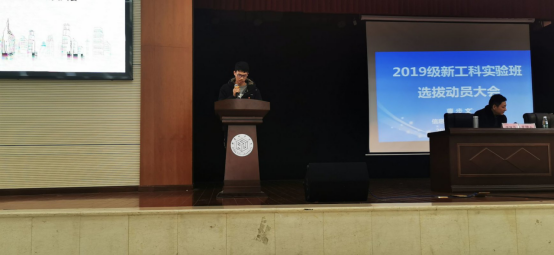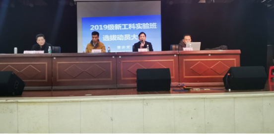 19级新工科实验班班主任廖枝平发言,他提及新工科实验班的优势所在,有更多参加各种省级、国家级竞赛机会,以及实验班的准入和退出机制、学习氛围、学习时间安排与计划等方面。