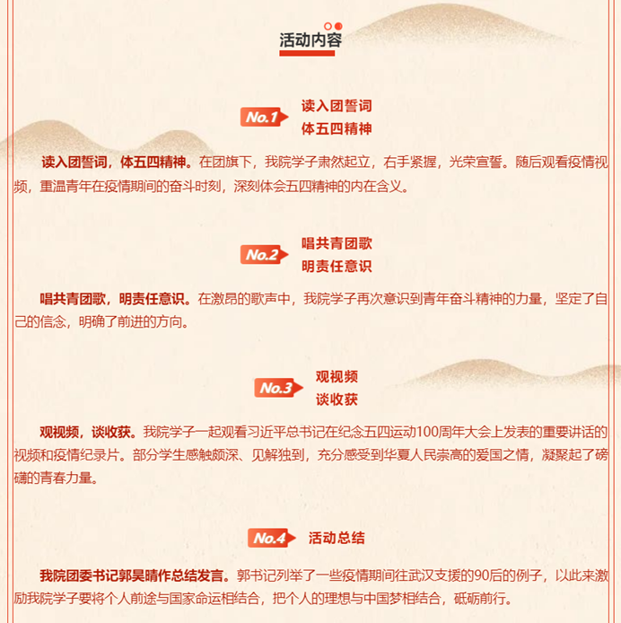 五四运动以来,我们看到无数青年为家国命运而流血牺牲,为民族命运而奋起捐躯。习近平主席强调:“青年一代有本领、有担当,国家就有前途,民族就有希望。”为响应此号召,公司团委在线上开展了以“薪火相传,五四有我”为主题的五四宣传教育活动。