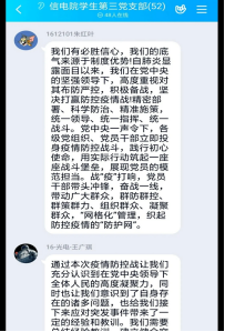 接着,各支部书记组织支部成员学习疫情中涌现的一批英雄人物,如武汉金银潭医院经理张定宇的不忘初心、“舍小我、顾大我”的精神、“用生命守护生命”的崔靖、战斗在最后一刻的大艾等,并结合熟知的相关事件发表个人看法。