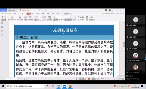 会议开始,心理部干事田龙宇发言介绍了有关新型冠状病毒肺炎的相关知识,强调了此次召开心委会议的目的;接着,心理部干事郭心怡就不同疫情处境下人的应激反应按等级进行了说明,有助各班心委对同学们由于疫情引起的心理问题进行开导、解决以及统计;大家积极参与疫情有关问题的讨论,都提出了对于疫情深刻的认识与对疫情期间同学们心理状况的管理意见;会议上郭昊晴老师就此次疫情谈了具体的做法,并且督促心理委员尽快完成班级疫情心理状况表的统计与上交。最后,心理部干事田龙宇对此次会议进行总结。